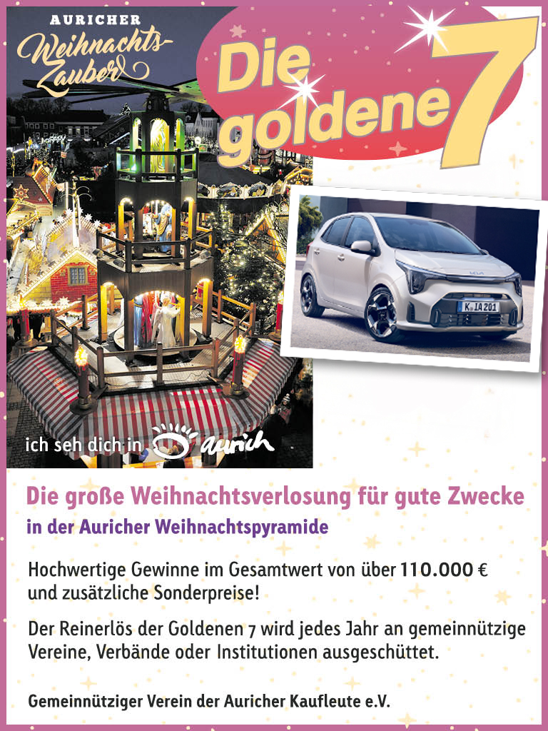 Mit der 41. Ausspielung der gemeinnützigen Weihnachts-Lotterie „Goldene 7“ gibt es in diesem Jahr wieder die große Chance auf Gewinne im Gesamtwert von mehr als 120.000 Euro. Es wurden mit der letzten Ausspielung der „Goldenen 7“ zum einen mehr als 5,23 Millionen Lose verkauft, zum anderen konnte ein Gesamt-Spenden-Volumen von mehr als 1,5s Millionen Euro ausgeschüttet werden. Die gemeinnützige Lotterie der Auricher Kaufleute leistet für das Gemeinwohl einen wertvollen Beitrag, der auf kommunaler Ebene kaum geleistet werden kann.